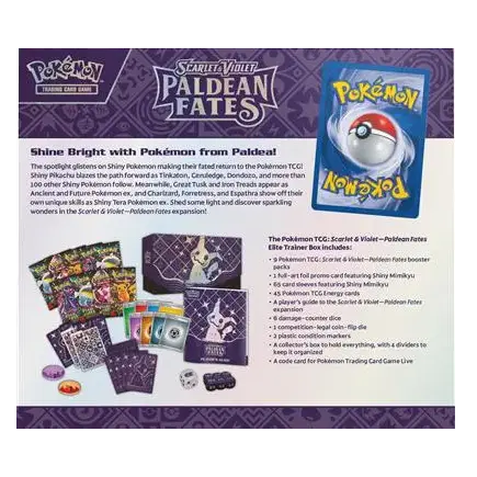 The Paldean Fates Elite Trainer Box is a highly collectible set featuring shiny Pokémon and exciting rare pulls.